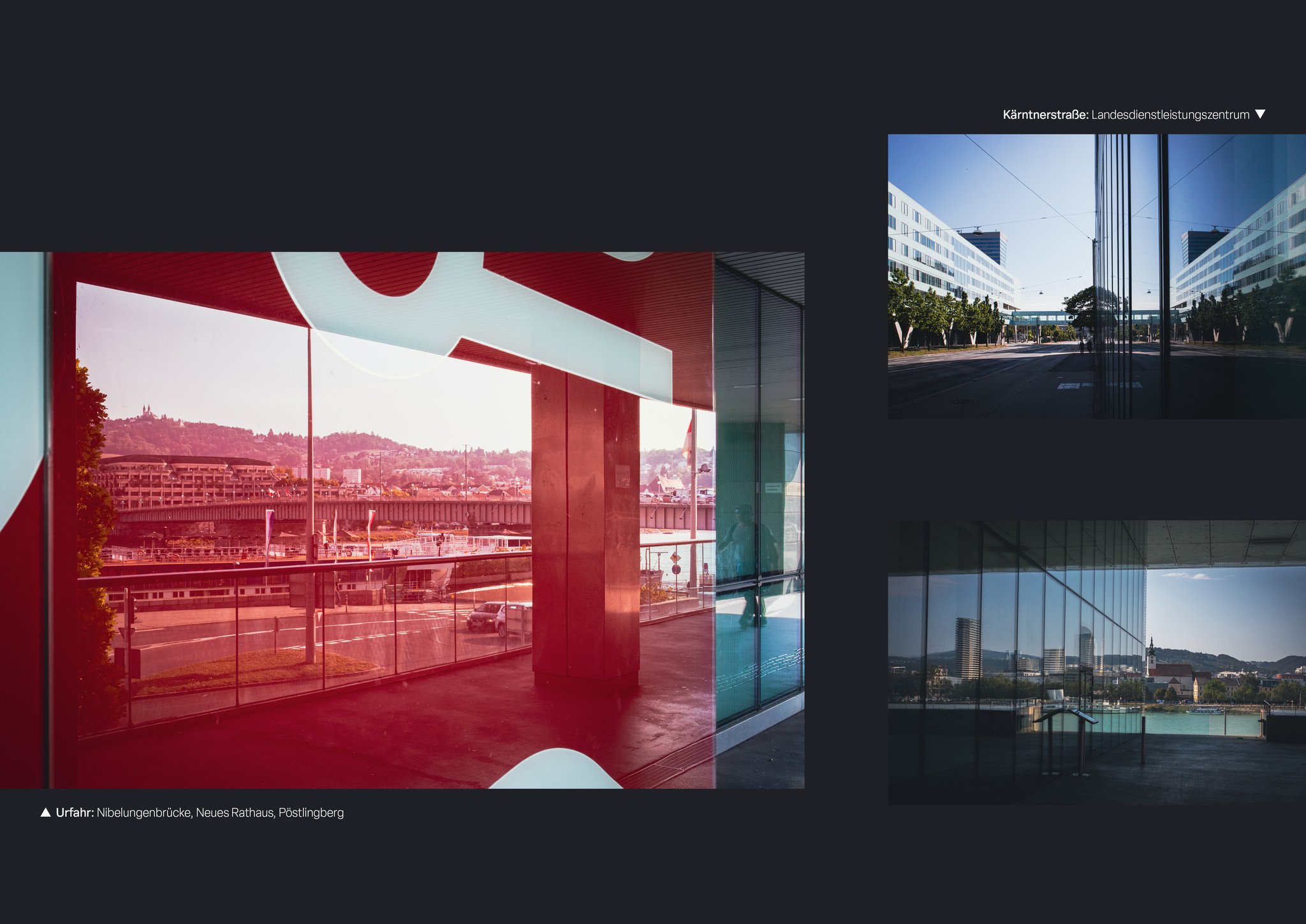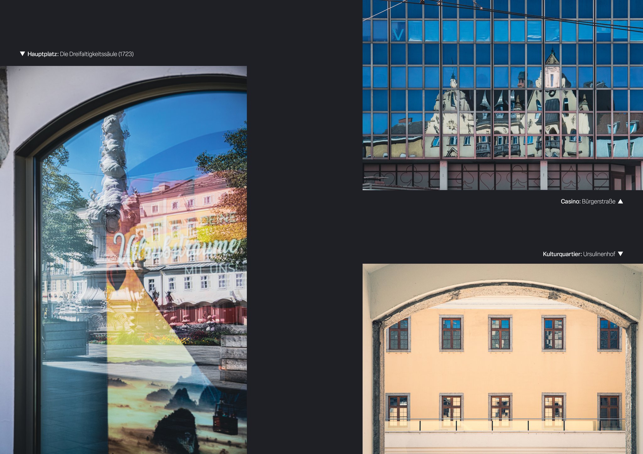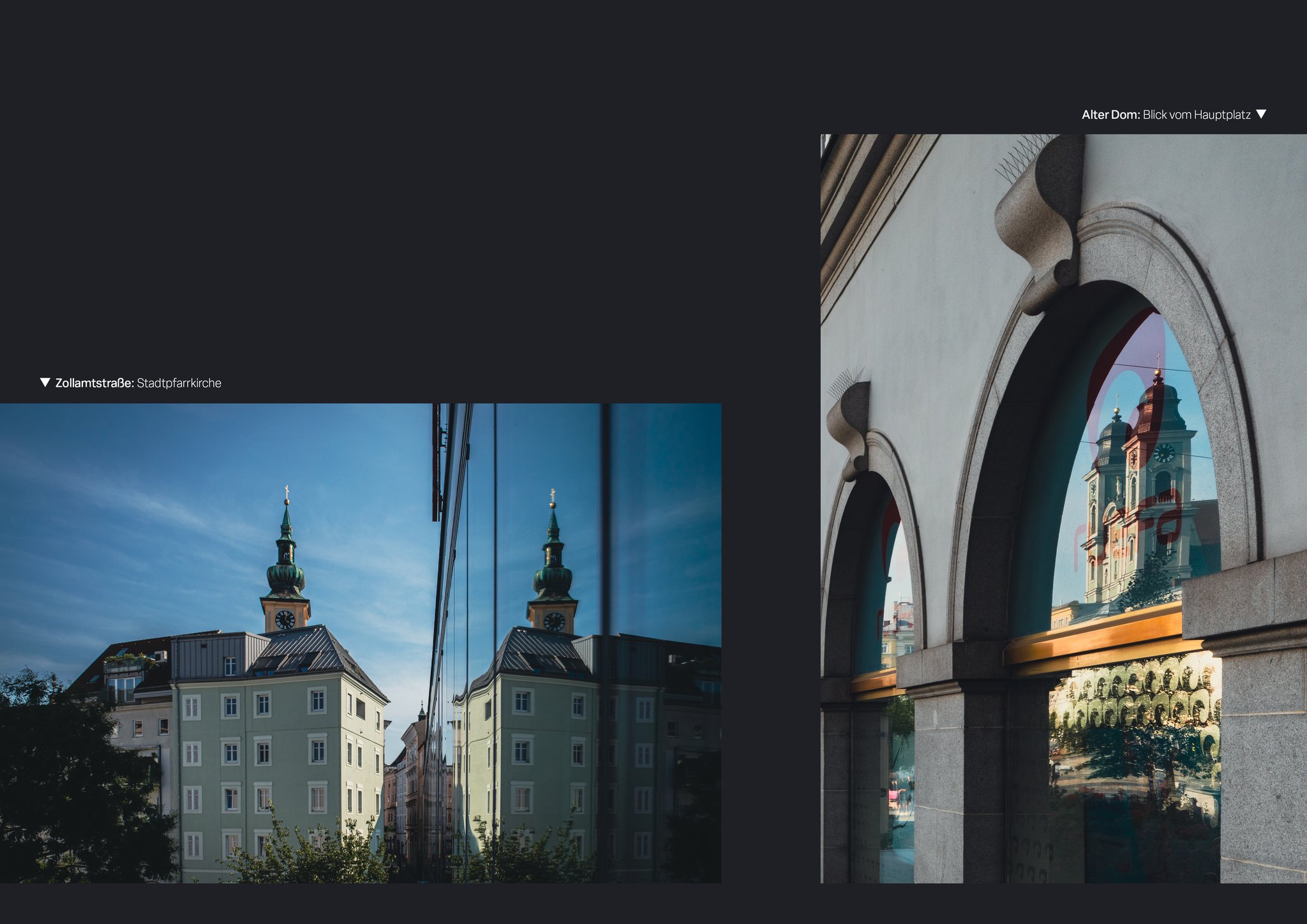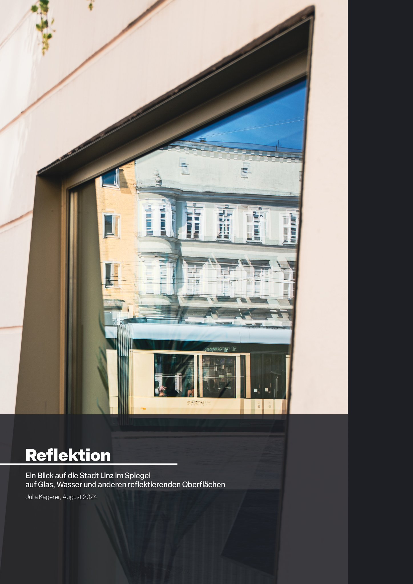 Ein Blick auf die Stadt Linz durch Reflektionen - auf Glas, Wasser und anderen spiegelnden Oberflächen