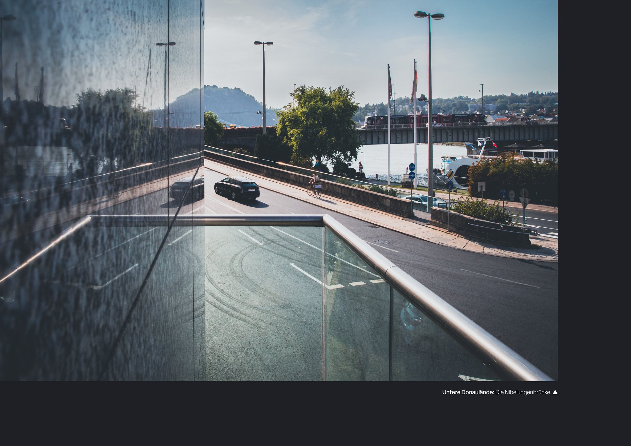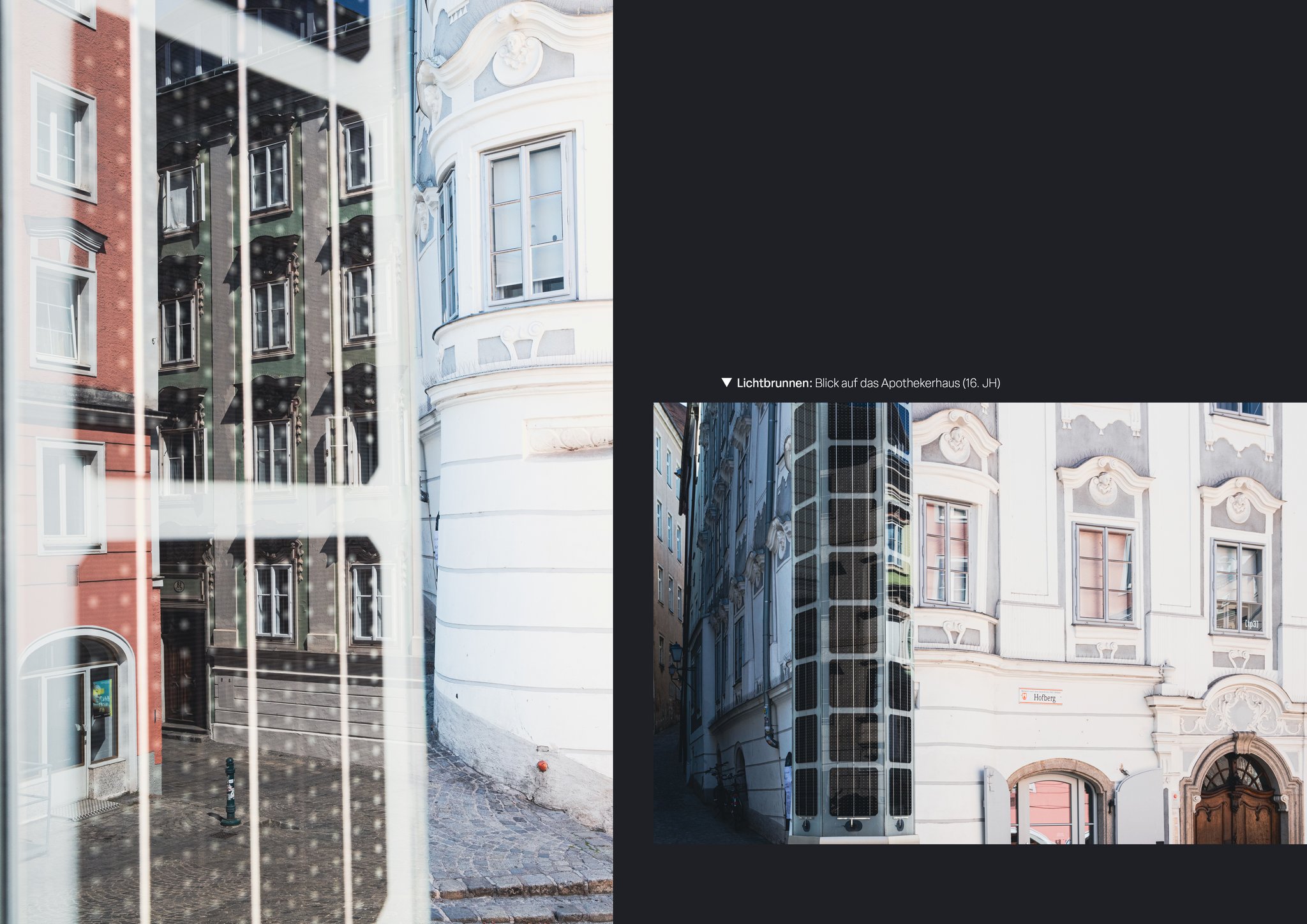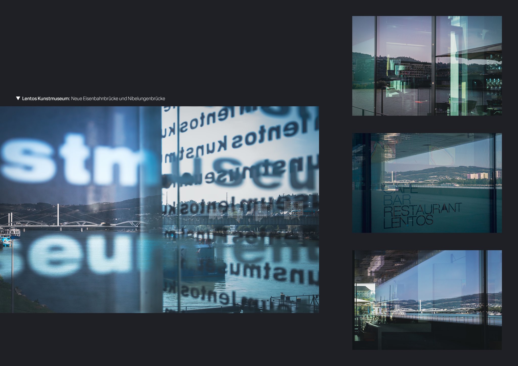 Ein Blick auf die Stadt Linz durch Reflektionen - auf Glas, Wasser und anderen spiegelnden Oberflächen